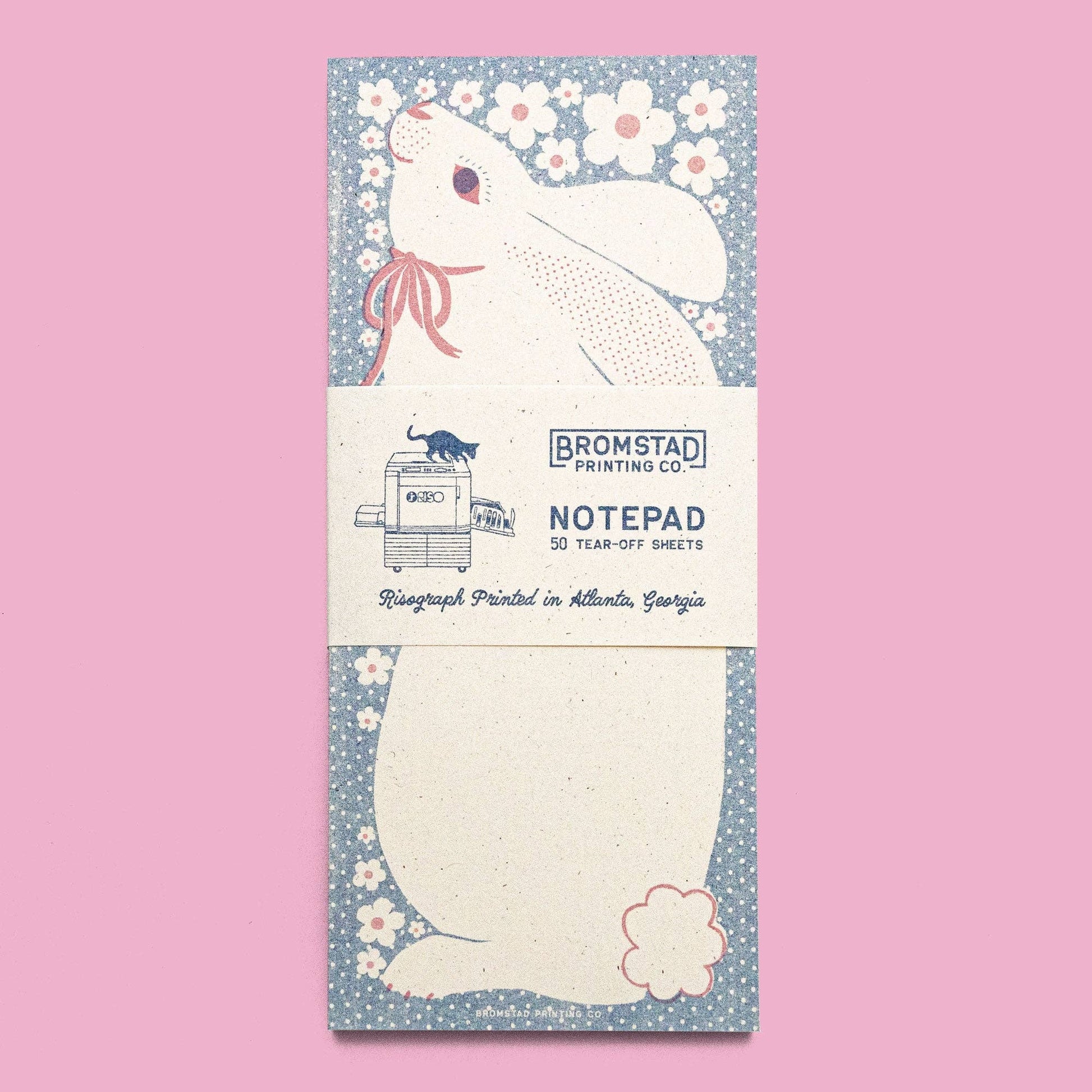 The sweetest little bunny is ready to hold your sweetest notes. Ditsy polka dots and a spray of little white flowers frame the white rabbit. Risograph printed in federal blue and light mauve.