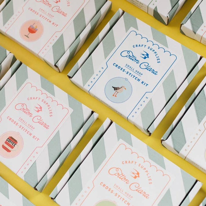 Each kit includes coloured aida fabric, embroidery thread, needle, hoop, wadding, full instructions, and a backing disc for easy display. Beautifully presented in our signature striped box with fully recyclable, plastic-free packaging.