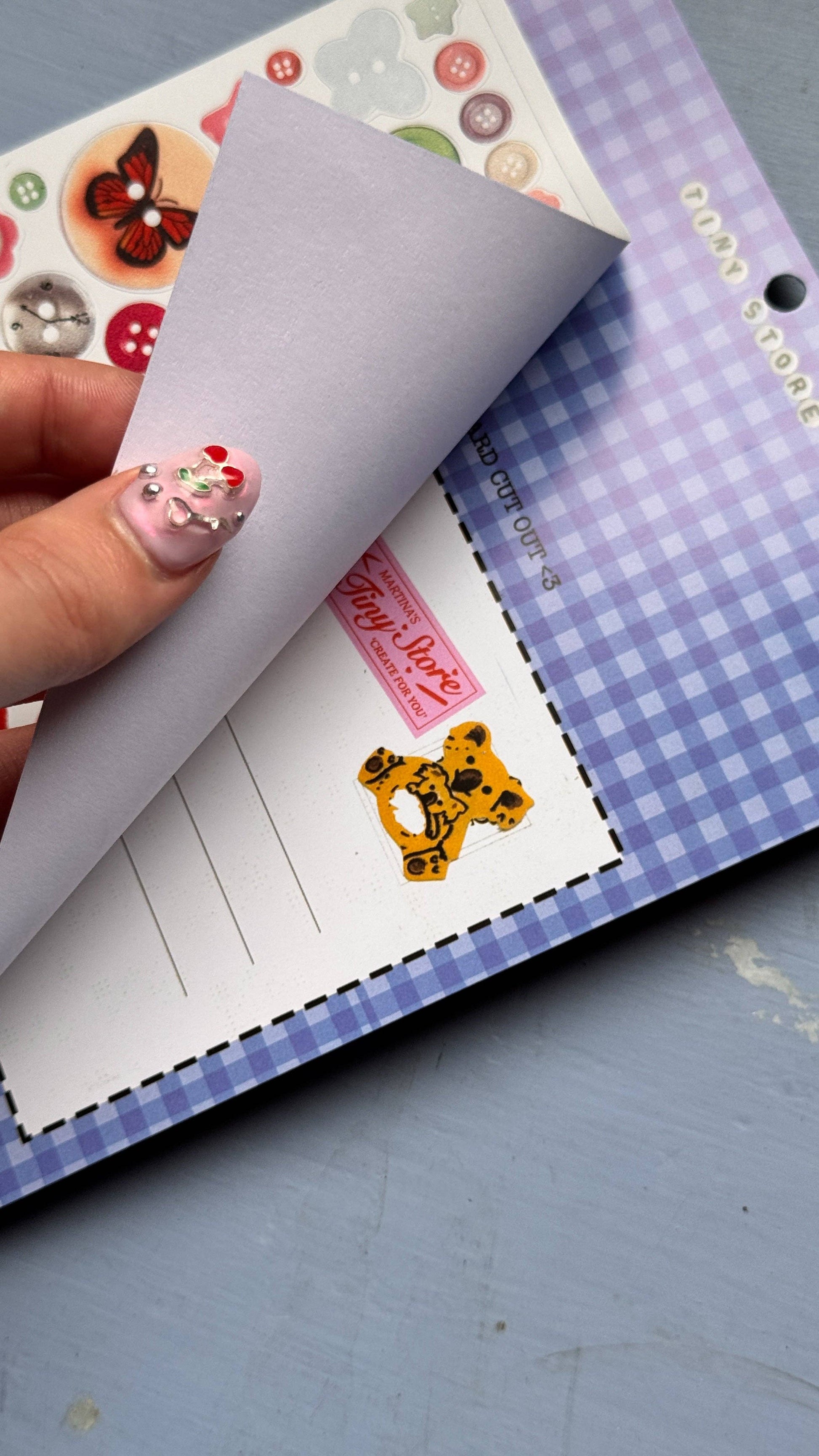 The perfect addition to any sticker collection- these lil buttons look so cute on any journal page, phone case, collage or craft project. A5 medium white vinyl stickersheet Backing card doubles as a special button pattern art print!