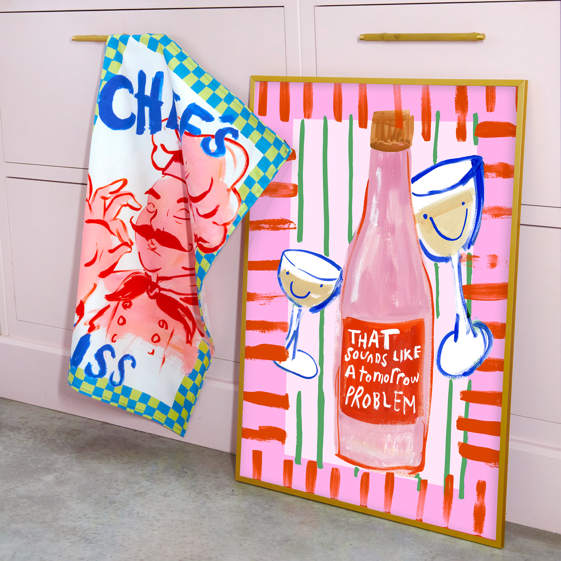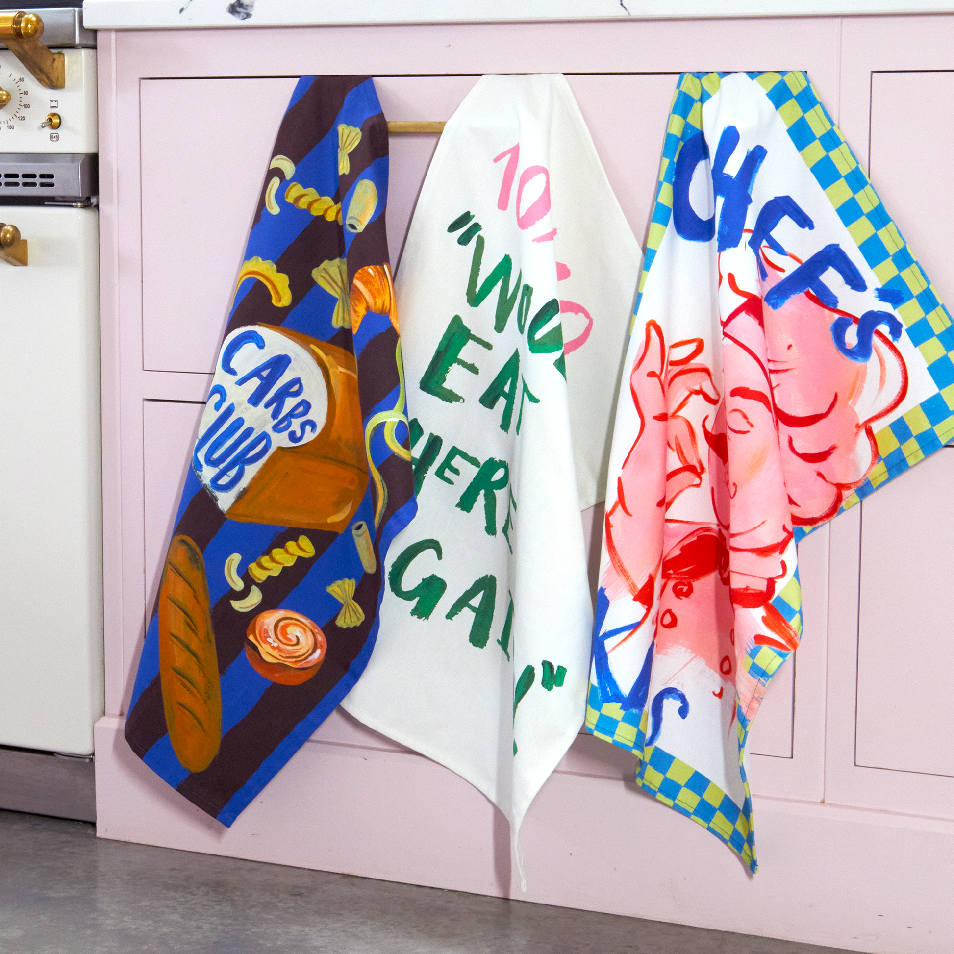 Add some fun to your kitchen with the Chef's Kiss Tea Towel. This vibrant yellow and blue checkerboard-bordered towel features an illustrated chef and electric blue lettering, making it the perfect tea towel to show your love for delicious food.