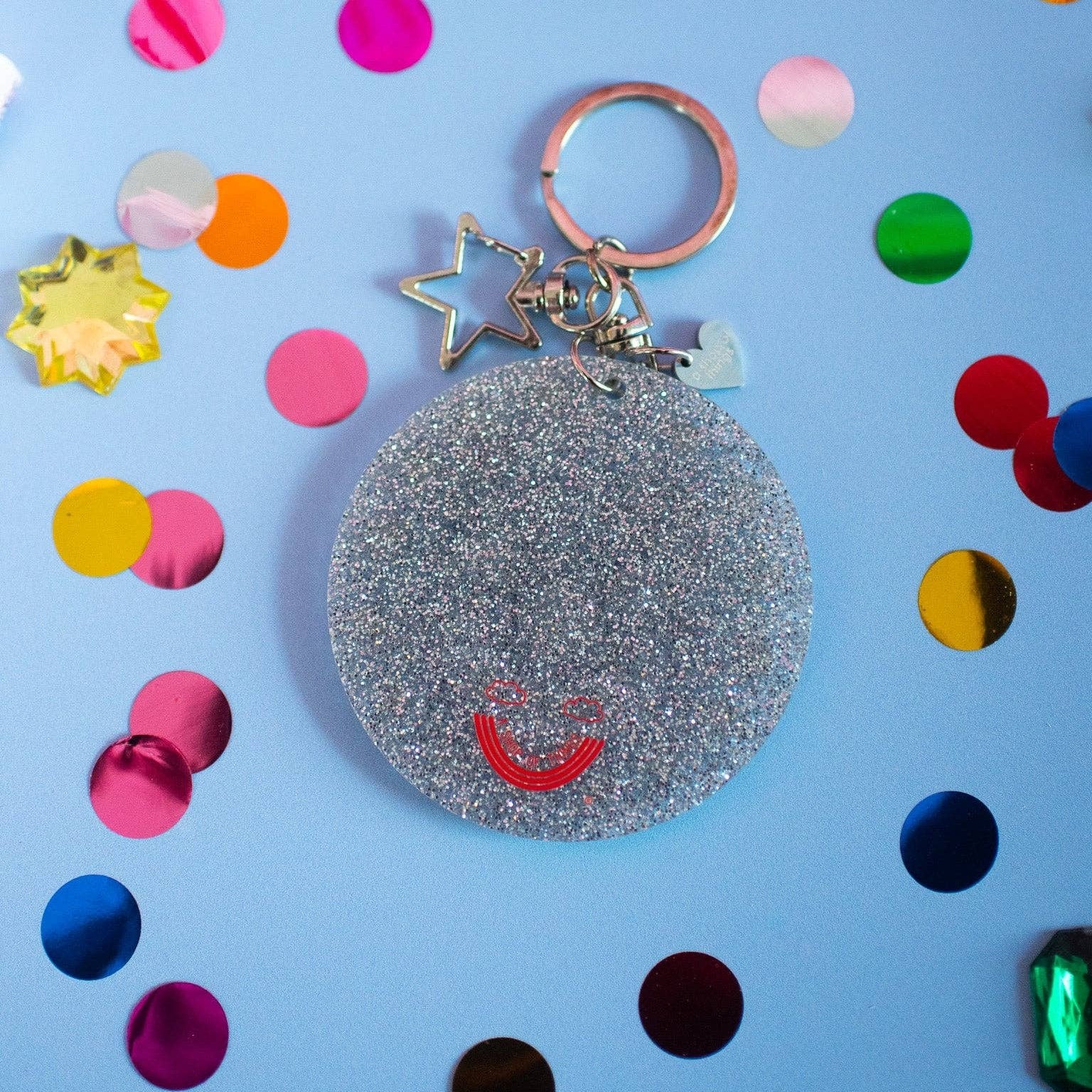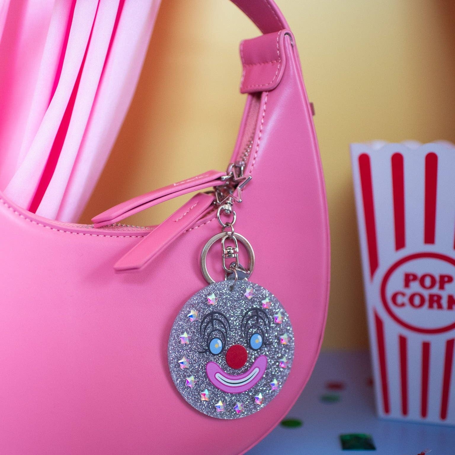 The perfect addition for the keys to your clown car! This acrylic glitter keychain features a smiling clown face surrounded by rhinestone stars! Comes with a silver, star-shaped, stay-closed clasp that's easy to add to your keyring without ruining your manicure. Measures 2.75" x 2.75