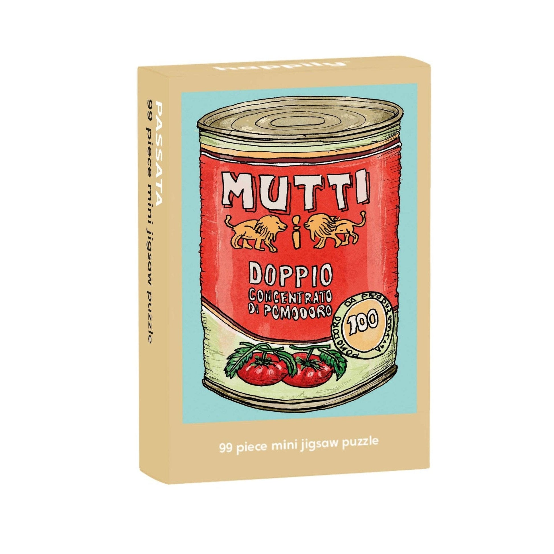 99 Piece Mini Jigsaw Puzzle featuring a fun illustration of a can of pasatta by Natalia Yañez-Stiel.