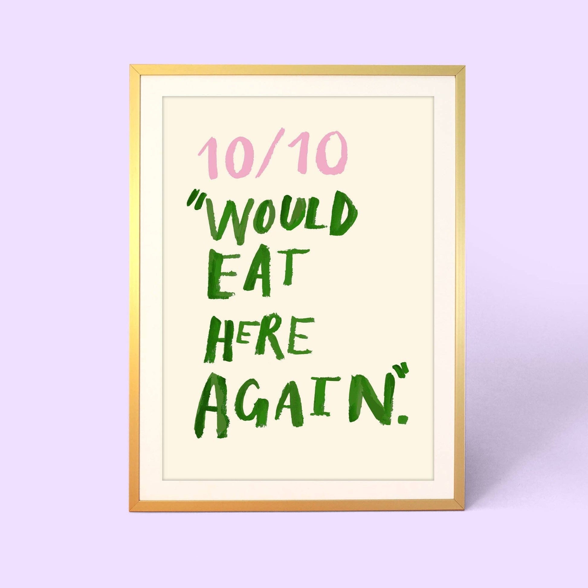 Featuring hand-painted typography of the words "10/10 Would Eat Here Again" displayed over a creamy background, this delightful print is the perfect addition to your kitchen, dining room, or any space where meals are shared.